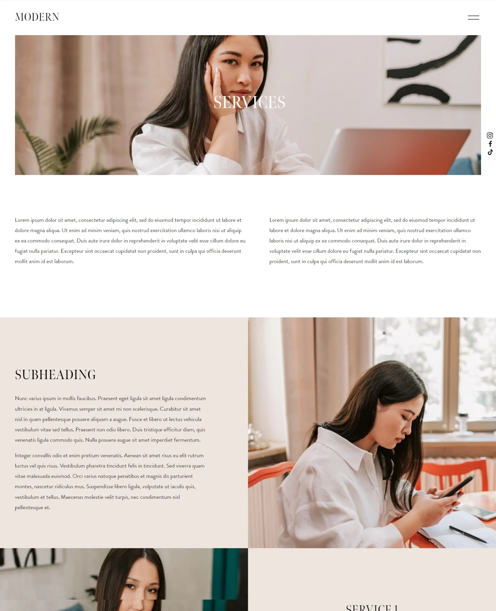 The Modern template is a clean, editorial Squarespace 7.1 template that’s perfect for you if you’re a service based business looking to showcase your services.